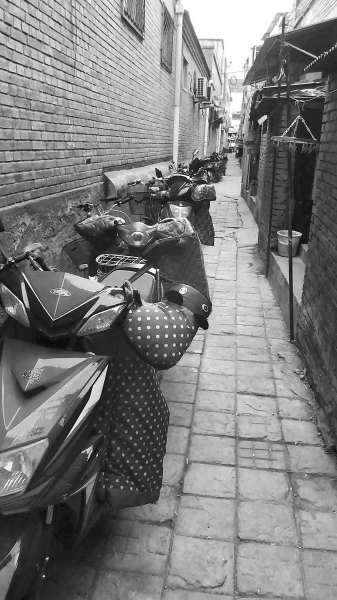 狭窄的过道,电动车停一串儿。