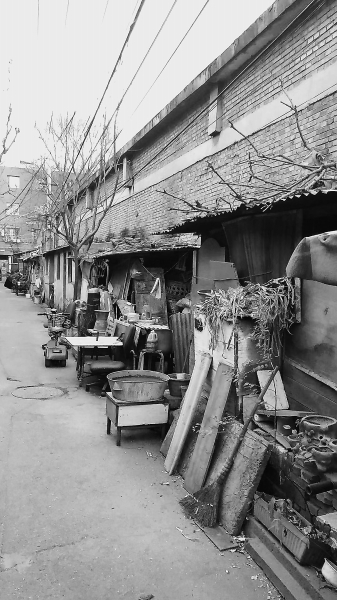 胡同里的杂物靠墙堆放。