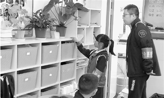 午餐过后,来不及休息,龚王以诺又跟着侯兆星检查起班级的卫生情况。“先要看地面是否干净,再看课桌卫生,然后看公共卫生角的扫帚、拖把是否摆放整齐,还有就是一些小地方,像地面有没有积水、垃圾分类有没有做好、窗台和书柜上有没有灰尘这些,都要特别注意。”在检查中,侯兆星不仅给龚王以诺点出检查重点,还从值周老师的视角引导她,作为一名学生应该如何打扫卫生。