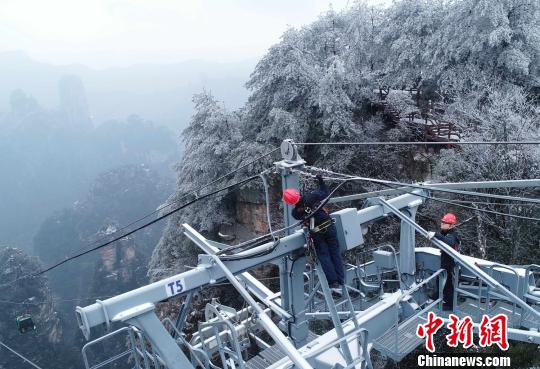 黄石寨索道检修工在冰雪天气对索道进行巡检。 吴勇兵 摄