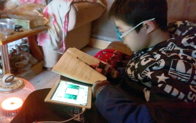 徐嘉靖坐在沙发上,双腿无力地垂下。很小的时候后,他就被确诊为重症肌无力。他看着手中的平板电脑,认真听着龚老师授课,遇到不懂的地方,他就停下来在旁边的课本或者稿纸上做着记录。