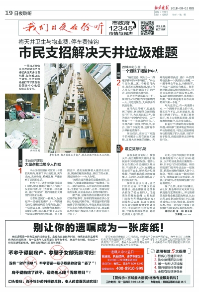 8月2日,本报以《市民支招解决天井垃圾难题》为题,报道了新兴家园、牛街东里二区的天井垃圾问题,其中前者为居民生活习惯所致,大量生活垃圾堆于天井,让住在一层的居民遭殃。后者除了涉及环境问题,还有安全隐患,楼上不定时往下扔酒瓶子,带来的不仅是扰民,居民更担心途经楼下时被砸中。天井垃圾是高空抛物的一种,其形式更为隐秘,带来的危害更大,坠入天井的垃圾,难于清理。