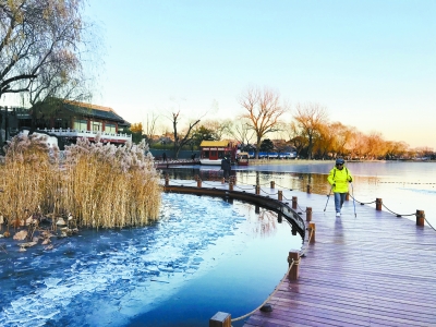 在西城区什刹海地区,新落成不久的西海湿地公园成了不少市民新的休闲地。这几天,虽然天气寒冷,但到湖边遛弯儿的市民依旧络绎不绝。到西海逛步道,走浮桥,观芦苇,看野鸭,已成为附近居民今冬的赏心乐事。