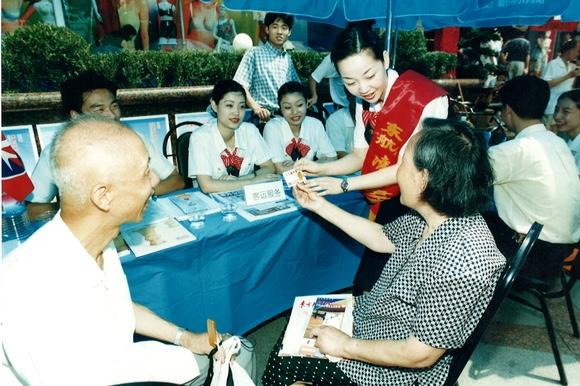 图片说明:上世纪90年代,东航志愿者在路上设摊为旅客提供咨询服务。(东航供图)