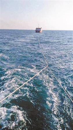 浙岱03158号渔船正在拖带无人游轮返回舟山