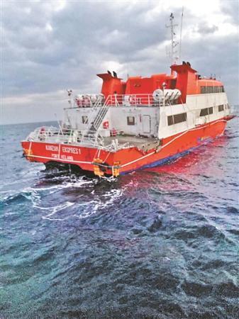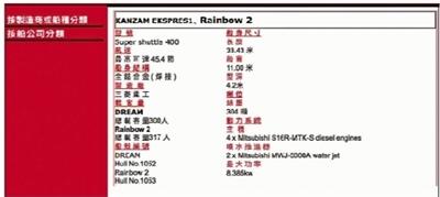 公开资料显示,“KANZAM EKSPRES1”前名为“DREAM”、“DREAM FLOWER”、“RAINBOW”,是大亚高速海运公司旗下双体高速水翼游轮,型号为Super Shuttle 400,船长33.43米,船宽11米,由三菱重工制造,排水量约304吨,装备4台三菱S16R-MTK-S柴油机,1993年3月竣工,其最大功率可达8385kw,最高航速为43节左右,最多可载300名旅客。