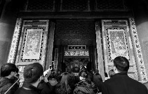 此次展览从腊月初一展至三月初三,为期三个月,分为文物展览和实景体验两部分。文物展览位于午门正殿和东西雁翅楼展厅,共展出文物885件(套)。实景体验部分包括整个紫禁城开放区域,都成为春节文化的展场,在宫殿门口会悬挂着寓意吉祥的春联、门神(上图),在廊庑下装饰着华美的宫灯,在乾清宫的丹陛上下竖立着高大的天灯、万寿灯,总共使用仿制品超过1000件。