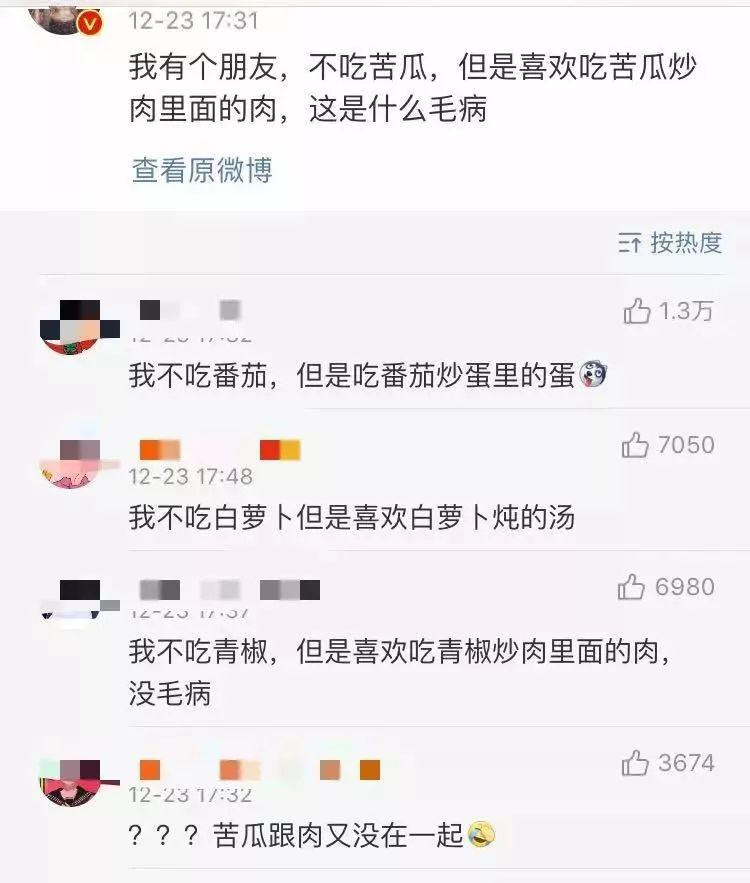紧接不吃海带之后的是不吃苦瓜,1288个赞。