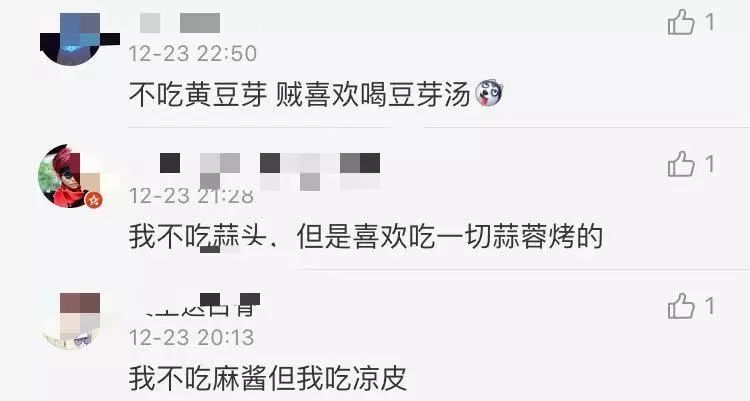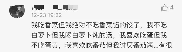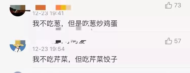 再看下去发现,还有“不吃芹菜,但吃芹菜饺子”“不吃胡萝卜,但是炖羊肉一定要给胡萝卜”“不吃皮蛋,但吃皮蛋粥”以及“不吃鸡,但是吃肯德基”的……