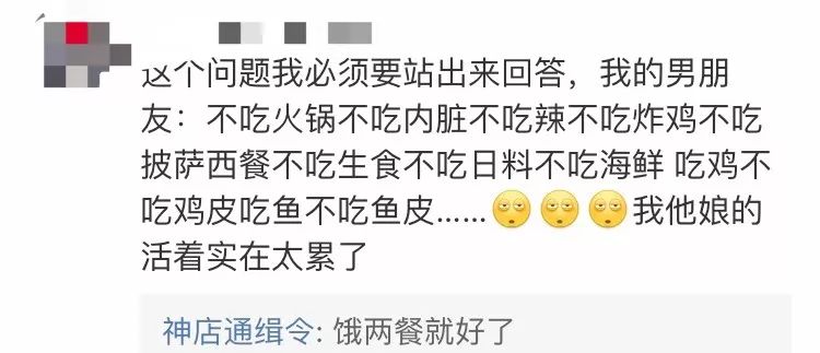 还有男朋友不吃火锅不吃内脏不吃辣不吃炸鸡不吃披萨不吃西餐不吃生食不吃日料不吃海鲜……女朋友活得太累系列。
