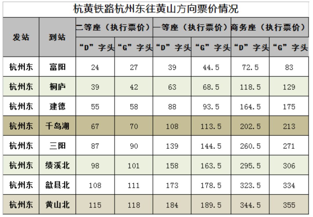 以D字头列车为例,二等座杭州东到富阳24元、到桐庐39元、到建德55元、到千岛湖67元、到黄山北115元。