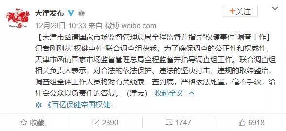 近段时间,权健保健品风波愈演愈烈。昨天(29日),天津市人民政府新闻办公室官方微博发文称,为了确保调查的公正性和权威性,天津市函请国家市场监督管理总局全程监督并指导调查组工作。