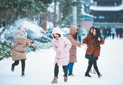 2018年12月30日,受连日来的强冷空气影响,贵州省黔东南苗族侗族自治州台江县气温持续走低,雪势进入最强时段,为最近10年最强的一次降雪,雪景美不胜收。当地民众纷纷走出户外赏雪、玩耍,开开心心度过元旦假期。据悉,当天贵州省全境共33个县(市)降下大雪。图为一群少女在戏雪。