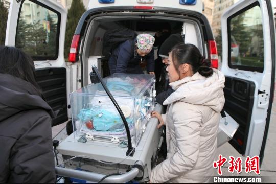 中新网兰州1月3日电 (田健 南如卓玛)1月2日下午4时55分,一架橘红色的医疗救援直升机降落在解放军联勤保障部队940医院的停机坪上,飞机内转运的是一名来自140公里外甘肃临夏州出生仅13天呼吸衰竭的新生儿。随后,随机一同前往临夏救援的甘肃省妇幼保健院医护人员将患儿送至救护车中,孩子被安全转运至设在甘肃省妇幼保健院的甘肃省新生儿重症救护中心接受治疗。
