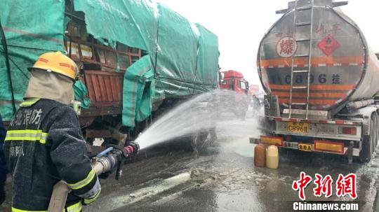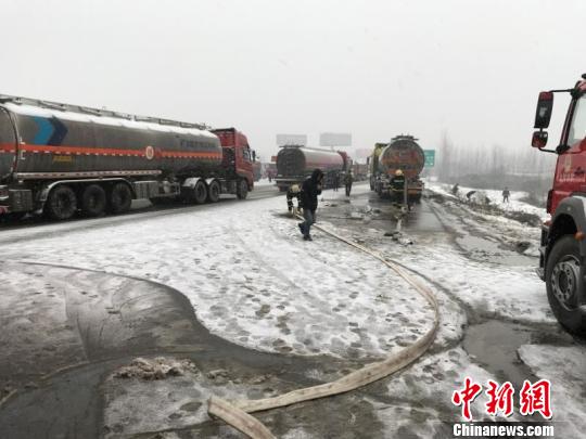 中新网襄阳1月9日电 (张东方 杨瑞 胡传林)一辆槽罐车高速入口附近遭追尾,大量柴油泄漏。当地消防、交警部门紧急处置,成功排除险情。