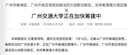 该报道称,2018年广州市政府工作报告指出,广州要筹建广州交通大学。