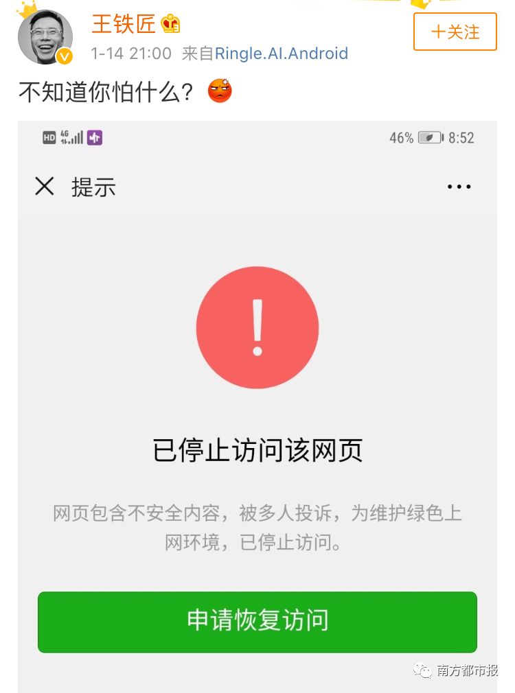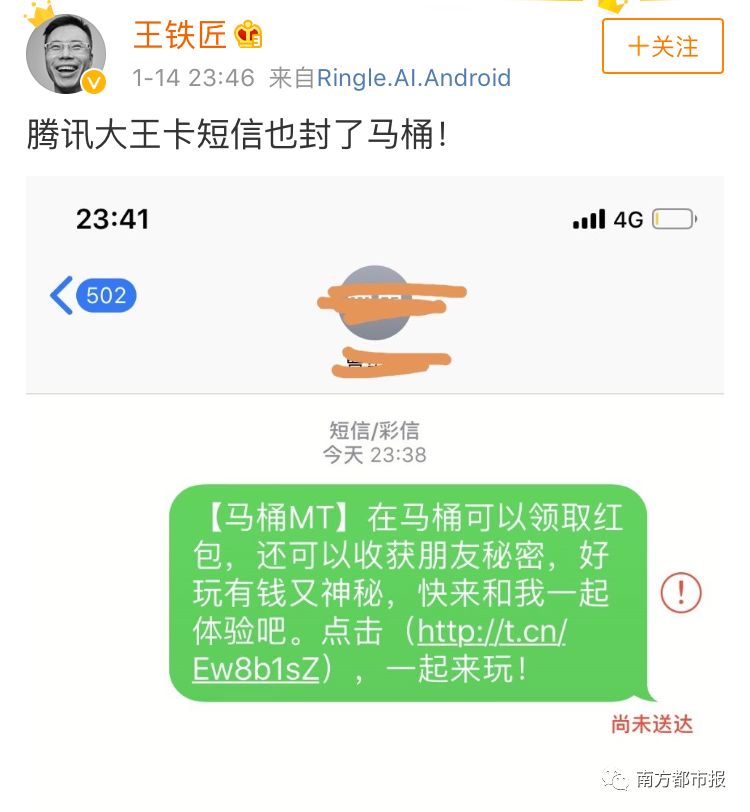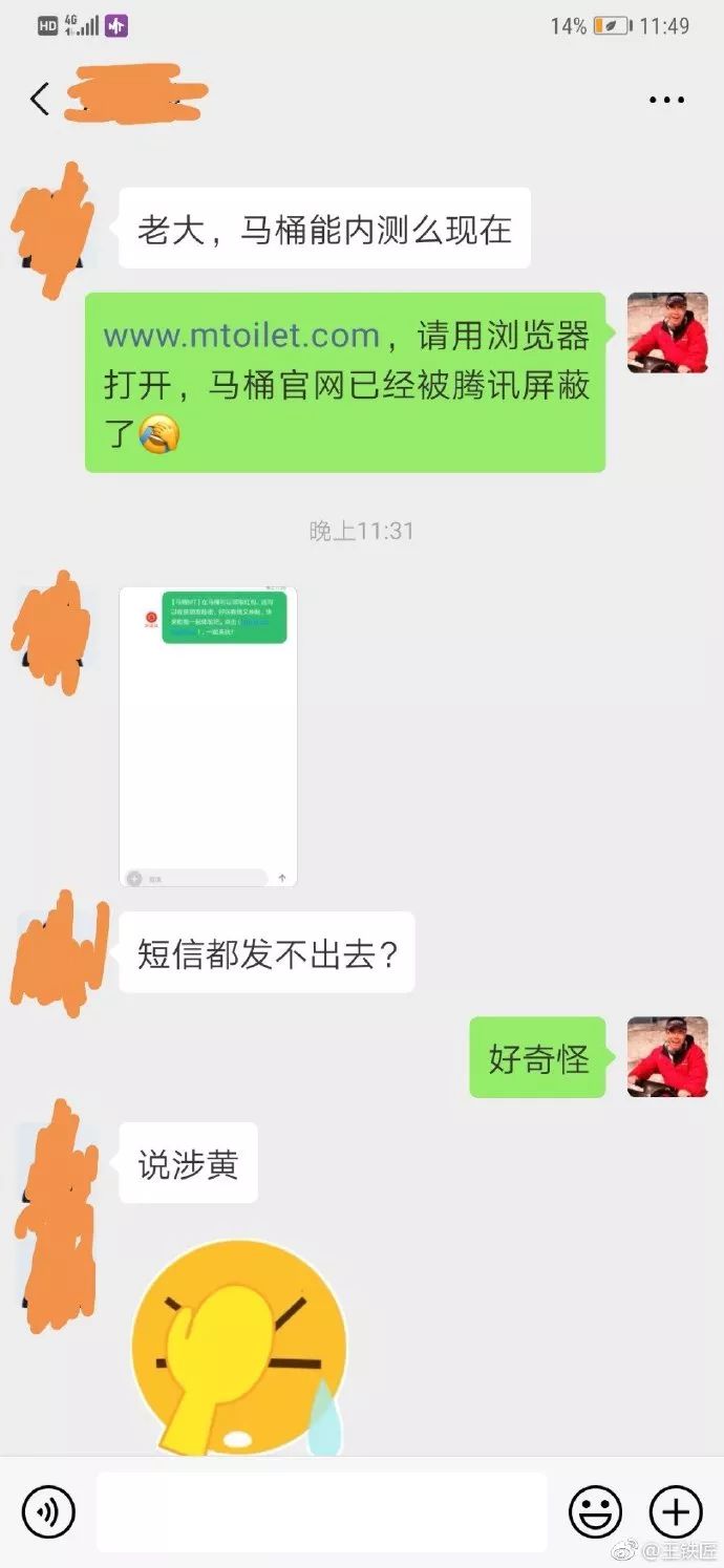 有意思的是,王欣的“马桶MT”尚未发布与微信之间便已经火药味十足。在发布会前夜,马桶官网下载链接、二维码在微信内被终止页面访问,随后王欣更指腾讯大王卡无法发送马桶的分享短信。