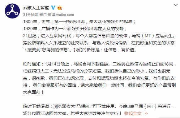 对于无法收到短信验证码的bug,云歌人工智能在其微博账号中回应,“我们承认自己的渺小,我们也很无奈,很抱歉,我们正在加紧处理,支付和提现功能也将在今晚恢复。有你们的支持, 我们会克服所有的困难,请大家给我们一点时间,我们会把更好的产品带到大家面前!”