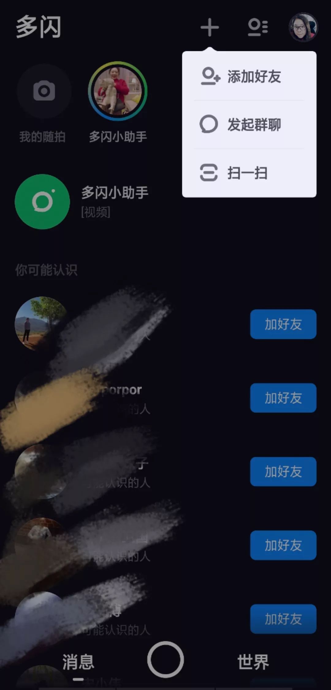在小编下载的安卓版多闪主页面正下方包含好友消息、随拍视频和“世界”三个板块,右上角则有个人头像、通讯录以及与微信高度类似的扫一扫、添加好友、发起群聊功能。不同于其他App的注册制,多闪仅支持抖音账号登陆,这也意味着用户必须先下载注册抖音后才能使用多闪。