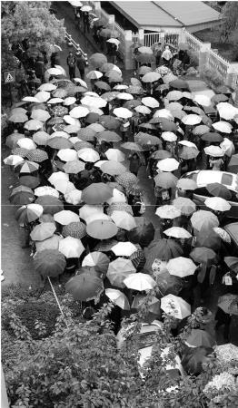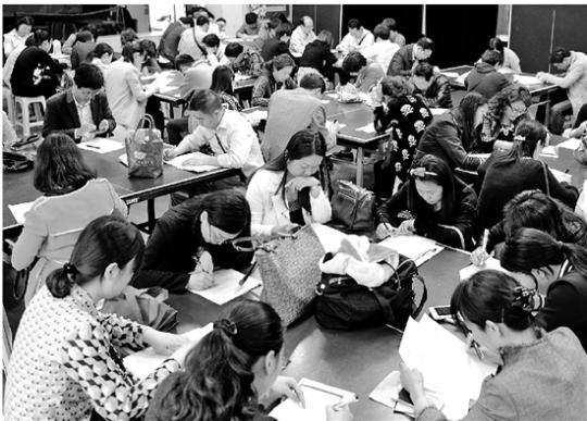 某民办小学招生日,在门口排长队的家长和参加问卷调查的家长(本报资料照片)