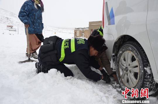 由于降雪、道路结冰,22日17时许,阿里地区普兰县巴嘎乡附近一辆载有7名游客的旅游车辆被困,塔尔钦边境派出所民警接到信息后立即赶赴事发地点,为车辆安装防滑链并将其推出被困区域。