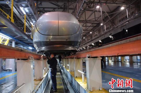 01:45,动车组机械师在进行车底检查 韦加恒 摄