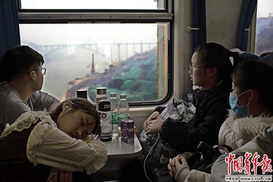 车上人密,气味杂,靠窗的徐艳平就一直戴着粉红色的口罩,口罩外露着白色的耳机线和银五星的耳钉,一双大眼睛骨碌碌地随着窗外的风景转动。她在浙江金华的印染厂做质检员,身旁30岁出头的丈夫何林是同一家厂的技术员。他们在四川南充下车,然后转车去阆中,8岁的孩子还在家等着他们。