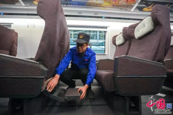 北京动车段一级修车间,机械师对动车组一等座脚踏板状态进行检查。中国网记者 郑亮摄