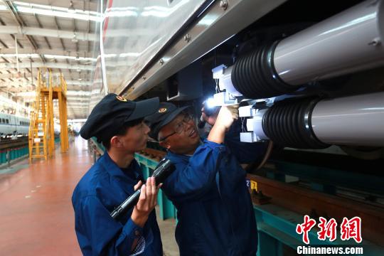 检修人员在“复兴号”两侧检测相关零部件。 吴华鹏 摄
