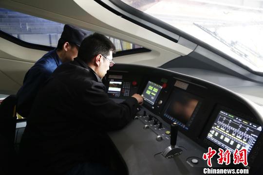 专业检修人员在“复兴号”司机室内进行检修作业。 沙见龙 摄