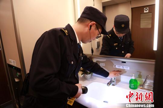 检修人员查看“复兴号”车内洗手台、卫生间、座椅等设施。 吴华鹏 摄