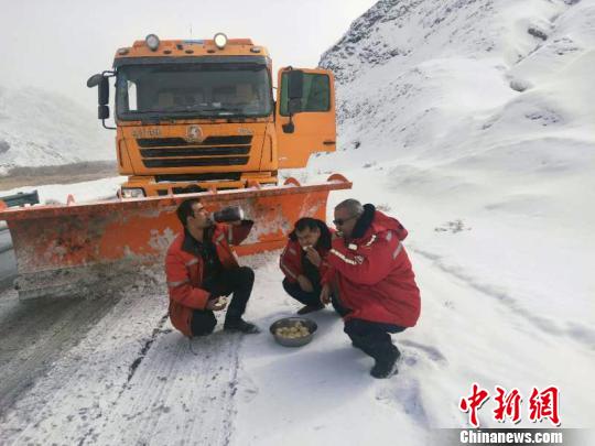 库尔勒公路管理局阿尔金山分局抢险除雪人员在G315线巴州若羌县阿尔金山高海拔山区路面清理积雪现场午餐。 李美玲 摄