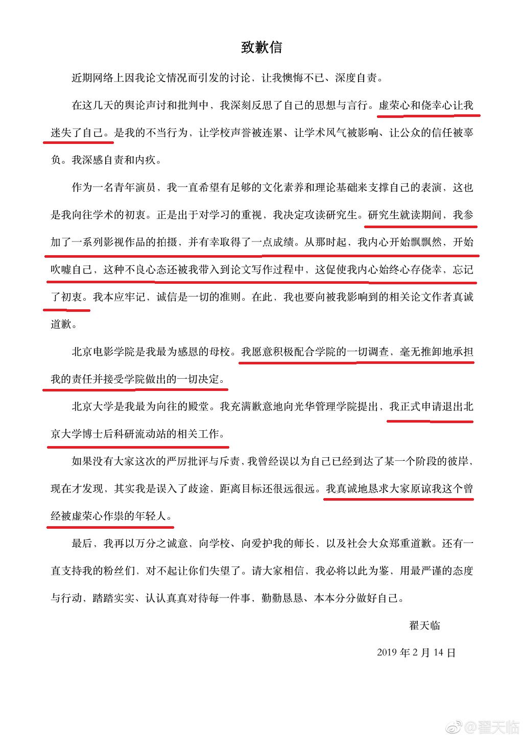 今天下午,翟天临在其微博发布致歉信,就最近他涉嫌学术不端一事做出道歉。