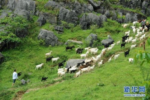 家住贵州省沿河县中寨镇三会溪村村民杨胜强(左)在山上放羊(2018年5月17日摄)。新华社记者 杨文斌 摄