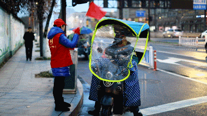 上周五(2月22日),雨难得停了一会儿,曹云妹穿上红马甲,带上旗子,外面套一件蓝色羽绒服,又出门去了。