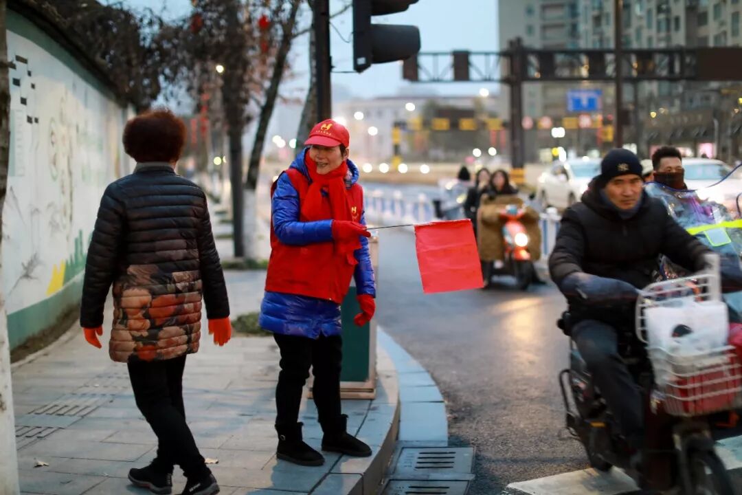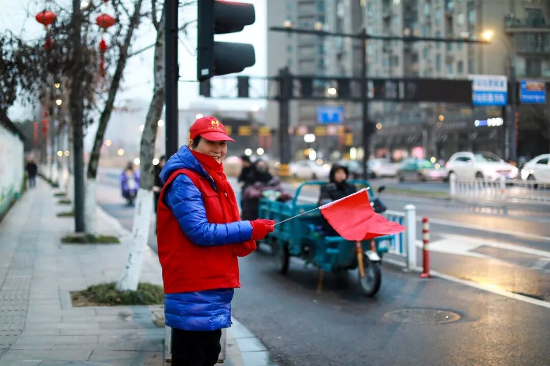 路口有点冷,她把羽绒服连帽也扣上来,加双棉手套,红灯了,朝非机动车道上电瓶车们挥挥旗子,一排车缓缓停在白线后。