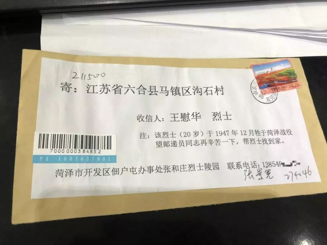 2月19日下午,莱芜邮政投递二部投递员朱玲华接到张景宪寄来的信件,收件人是:山东省莱芜县汶阳区米家村徐恒古烈士和山东省莱芜县汶阳区戈林庄陈芘友烈士。