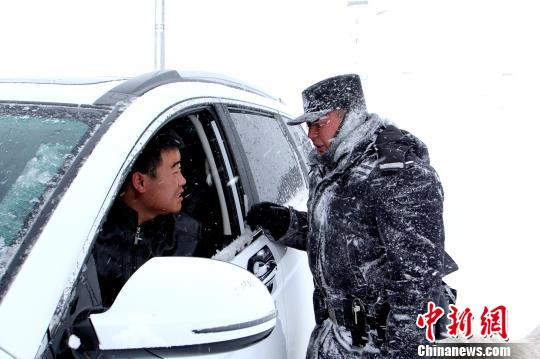 图为西藏边境管理支队帕里边境派出所民警在对过往车辆进行安全提醒。 刘红卫 摄