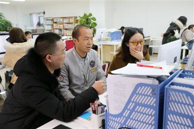 雷海为(中)跟同事一起修订教材