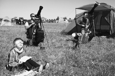 父女俩在美国怀俄明州与爱达荷州之间的维克托镇营地观测日全食。