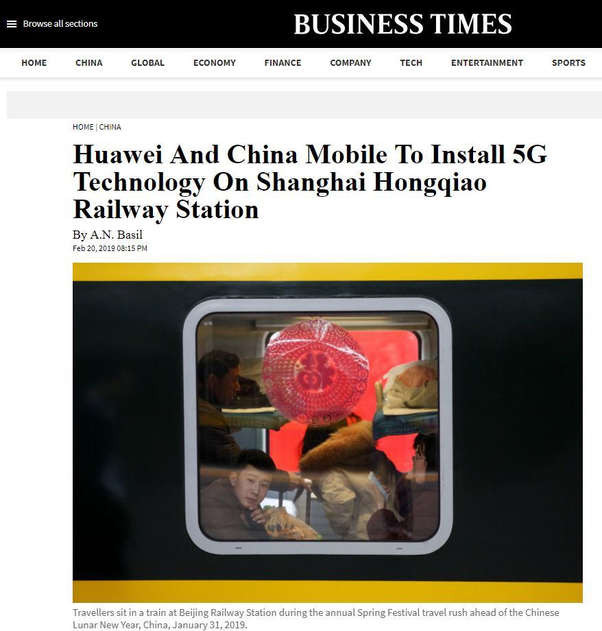 当天,新加坡《商业时报》也发表文章称,中国在虹桥火车站启动5G网络建设,这为建设全球首个采用5G室内数字系统建设的火车站奠定基础。