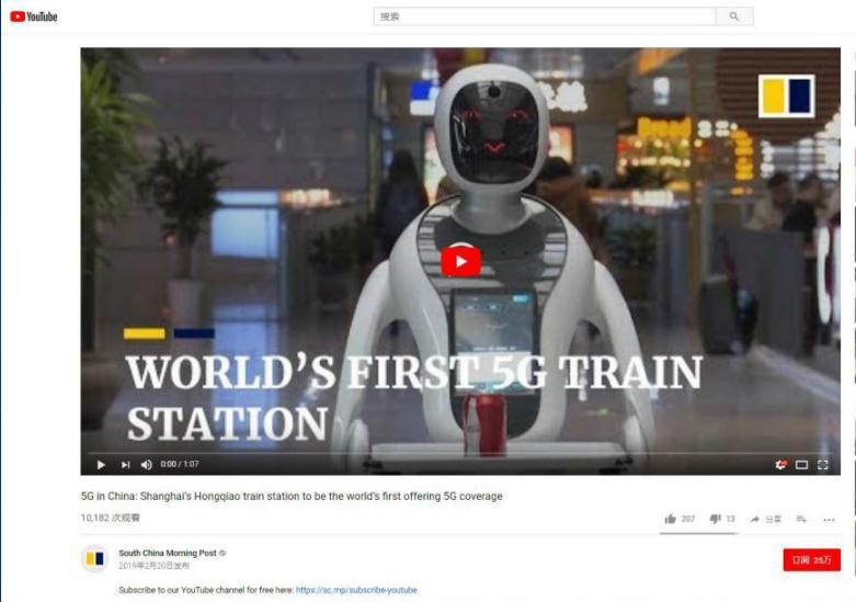 2月20日,香港《南华早报》在YouTube上发布题为《中国5G:首个5G火车站落地上海虹桥 将实现5G全覆盖》的视频。视频称,中国力争到2020年实现全国5G商用,5G系统将提高乘客上网速度,乘客还可使用连接5G网络的智能机器人。