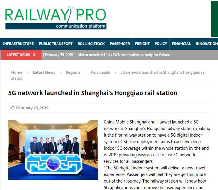 此外,美国商业类杂志"Railwaypro”网站报道称,虹桥火车站的5G网络建设是上海5G商用的一个重要里程碑,将为上海建设“双千兆宽带城市”(移动通信网络和固定宽带网络双双实现千兆全市覆盖)奠定坚实基础。