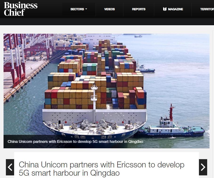 美国商业新闻网站“business chief”发布题为《中国与瑞典爱立信公司共建青岛5G智能码头》的文章。瑞典爱立信公司高级副总裁克里斯·休顿表示,青岛5G智能码头是5G产业合作的先锋项目。他还说,建设5G码头的方案不仅适用于青岛,也能被其他码头和产业复制。