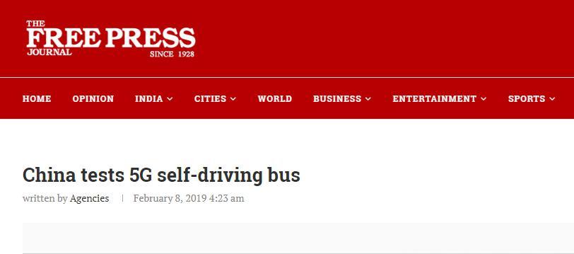 次日,印度《自由新闻报》发布相关报道称,该车依靠5G网络,在车载激光雷达全方位探测等新技术支撑下,可以完成所有自动驾驶的操作。文章还指出,5G网络在中国的覆盖范围逐步扩大。目前,中国首个5G基站已经在广州开通。