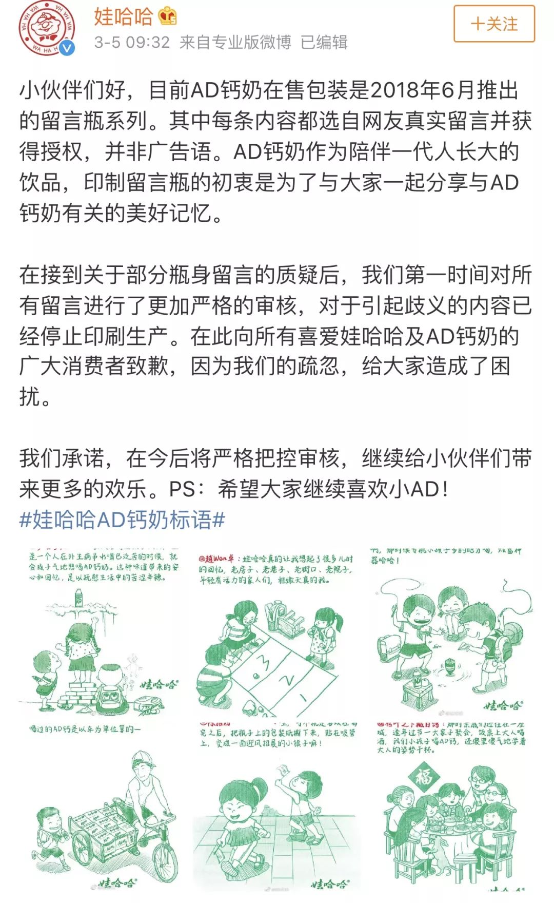 针对此事,3月5日上午@娃哈哈 发文表示,在接到关于部分瓶身留言的质疑后,我们第一时间对所有留言进行了更加严格的审核,对于引起歧义的内容已经停止印刷。在此向所有喜爱娃哈哈及AD钙奶的广大消费者致歉,因为我们的疏忽,给大家造成了困扰。娃哈哈承诺,在今后严格把控审核。