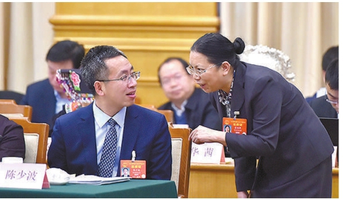 全国人大代表陈少波(左)与全国人大代表晏婉萍相互交流。