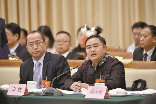全国人大代表韦波(右)就审议政府工作报告发言。