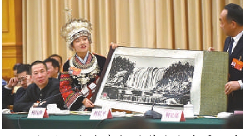 全国人大代表杨昌芹向大家展示家乡的赤水竹编。
