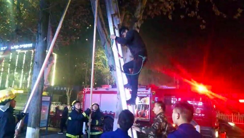 湖北襄阳,一名自称是流浪动物救助站志愿者的男青年试图去救一只黑猫,爬上离地面15米高的树叉上时,才发现上下不得,自己反成了需要被救的那个。而那只黑猫似受惊吓,从树上跳到地面后跑了...最终消防员到场,架设拉梯将男青年救下。